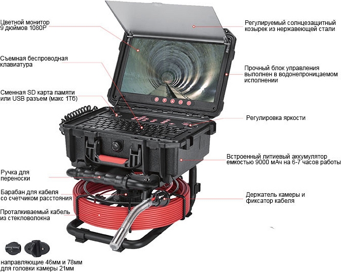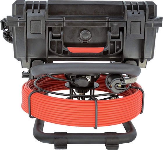 - Головка камеры Ø 21 × 45 мм и проталкиваемый кабель Ø 5,3 мм × 30 м из стекловолокна со счетчиком длины, подходящие для труб Ø 50 – 125 мм, длиной до 30 м
