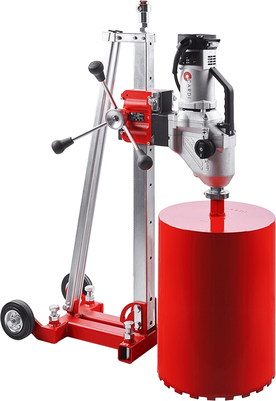 Установка алмазного бурения Cardi 500 (Карди 500) с неимеющем аналогов в мире сверлильным двигателем с 6-ти скоростным редуктором! Имеет широкий диапазон различных скоростей позволяет установить наилучшую скорость для алмазного сверления отверстий! Предназначена для алмазного бурения отверстий Ø 25 – 500 мм в бетоне, высокоармированном бетоне, а также Ø 25 – 600 мм в асфальте, кирпичной кладке под углом 0° – 75° с обязательной подачей воды.